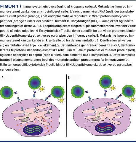 Effekten af terapeutisk cancervaccination beror på et effektivt tumorspecifikt T-cellerespons, hvor tumorreaktive T-celler kan genkende og eliminere tumorceller [5]. Denne genkendelse beror på T-cellernes evne til at overvåge, hvilke proteiner organismens celler producerer (Figur 1). Talrige eksperimentelle studier har vist, at T-celler kan genkende kræftceller, og målet med terapeutisk cancervaccination er således at forstærke denne genkendelse og inducere tumorcelledrab. Dette opnås ved at lade antigenpræsenterende celler (APC) – primært dendritiske celler – præsentere tumorantigen på overfladen af humant leukocytantigen (HLA)-I og HLA-II for derved at inducere et immunrespons mod disse tumorantigener. Der eksisterer talrige former for terapeutiske cancervacciner, men i den mest enkle form, peptidvaccination, injiceres en epitop i form af et eller flere peptider subkutant sammen med en adjuvans. Dette stimulerer immunsystemet til at rejse et immunrespons mod den injicerede epitop (Figur 2). T-celler genkender tumorceller ved, at sidstnævnte udstiller antigen på HLA-I/II-komplekser, og det er disse antigener, der ønskes rejst et immunrespons mod ved vaccination. Overordnet set er der to klasser tumorantigener: de tumorassocierede antigener (TAA) og de tumorspecifikke antigener (TSA). TAA udtrykkes af både tumorceller og raske celler, hvorimod TSA udelukkende udtrykkes af tumorceller [6]. Hver klasse tumorantigen har således fordele og ulemper, som bør tages i betragtning, når et antigen udvælges som mål for terapeutisk cancervaccination (Tabel 1).