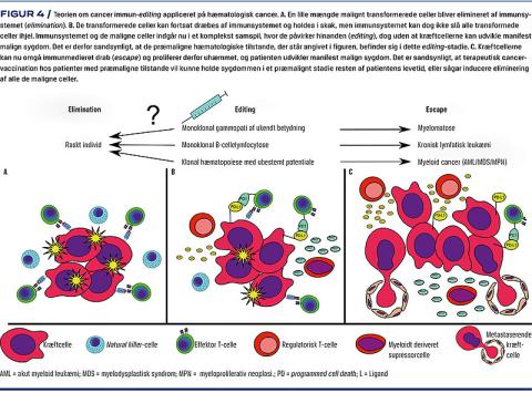 Overordnet set har terapeutisk cancervaccination vist størst effekt hos patienter med lav sygdomsbyrde. Dette skyldes sandsynligvis, at canceren hos patienter med høj tumorbyrde er i stand til at hæmme immunsystemet. Derfor giver det i høj grad mening at vaccinere hæmatologiske patienter, når de er bragt i så dyb en remission som muligt. En anden mulighed er at vaccinere patienter, inden de udvikler manifest cancer. Studier med patienter med forstadier til solide kræftformer, såsom vulvær intraepitelial neoplasi, har vist, at terapeutisk cancervaccination i disse tidlige kræftstadier kan eliminere de maligne forstadier [26]. Adskillige hæmatologiske cancerformer har et præmalignt stadie; for kronisk lymfatisk leukæmi er det monoklonal B-celle-lymfocytose, for myelomatose er det monoklonal gammopati af ukendt betydning og såkaldt ulmende myelomatose. Samtidig har befolkningsundersøgelser vist, at en del af den raske baggrundsbefolkning har genmutationer, der er sammenfaldende med de mutationer, der hyppigt ses ved myeloid cancer, og at disse raske bærere rent faktisk har øget risiko for at udvikle netop myeloid cancer [27, 28]. En sandsynlig forklaring på eksistensen af sådanne præmaligne tilstande er, at immunsystemet kan holde de transformerede celler i skak og forhindre udviklingen af manifest malign sygdom. Set i relation til teorien om cancer immun-editing [29, 30] befinder disse præmaligne tilstande sig i editing-stadiet, hvor kræftcellerne og immunsystemet indgår i et komplekst samspil. En gruppe af disse bærere af en præmalign tilstand vil efter en periode opleve et immun-escape, hvor tumorcellerne omgår immunmedieret kontrol med efterfølgende udvikling af dissemineret malign sygdom (Figur 4). En mulig måde, hvorpå dette escape kan undgås, eller hvor immunsystemet sågar kan eliminere den præmaligne tilstand, vil være ved hjælp af cancervaccination. For at afprøve det kliniske potentiale for vaccination i det tidligste sygdomsstadie er der på CCIT-DK iværksat et klinisk fase 2-vaccinationsforsøg med en PD-L1-deriveret epitop, som testes hos patienter med ulmende myelomatose (NCT03850522).