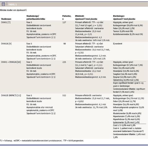 Sipuleucel-T er undersøgt i tre ens designede, randomiserede fase 3-studier med i alt 737 patienter (Tabel 1) [7, 9-11]. Patienterne blev i alle tre studier randomiseret 2:1 mellem sipuleucel-T og placebo. Placebovaccinen blev fremstillet ved at dyrke APC fra en tredjedel af de mononukleære celler, der var udtaget ved leukoferesen. Disse blev opbevaret i et medium i 36-44 timer ved 2-8 °C uden at blive tilføjet PA2024. De resterende celler blev kryopræserveret til eventuelt senere brug ved progressiv sygdom. Ved progression blev patienterne afblindet, og placebogruppen blev tilbudt et produkt, som var fremstillet på samme måde som sipuleucel-T, men ud fra de