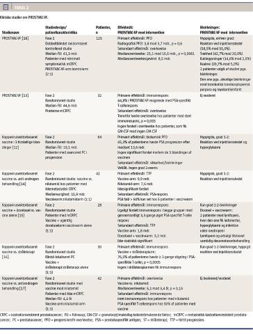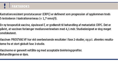 PSA-respons eller påvirkning af tid til radiografisk progression. Således må det antages, at vaccinationseffekten virker sygdomsstabiliserende uden tumordestruktion, eller at den har en synergistisk effekt på efterfølgende behandlinger. Med introduktionen af flere nye behandlingstilbud for CRPC opstår der andre dilemmaer. Behandlingerne er dyre, hvilket kræver, at både industri, politikere, behandlere og patientorganisationer arbejder sammen om at finde en fællesstrategi for ibrugtagning af de nye lægemidler. Den vanskeligste faglige udfordring er valg af rækkefølge for de nye behandlinger. Det kan ikke forventes, at de nye lægemidler til behandling af CRPC har additiv effekt på overlevelsen, og ultimativt må sekvensen af behandlinger belyses i randomiserede studier. Indtil da må faglig ekspertise afgøre både selektionskriterier og sekvens af behandling hos den enkelte patient. Et tungtvejende argument for en tidlig placering af terapeutiske vacciner i forløbet af CRPC er den mulige immunkompromitterende effekt af fremskreden cancersygdom og senere kemoterapi, hvilket sandsynligvis vil reducere effekten af vaccinen. Der foregår p.t. et fase 2-studie, hvor PROSTVAC kombineres med docetaxel, som muligvis kan besvare dette. Binyrebarkhormon anvendes både som tillæg til det nye godkendte lægemiddel i CRPC-behandlingen, abirateron, og i palliativt øjemed ved fremskreden PC, og binyrebarkhormon må antages ikke at kunne anvendes i kombination med vaccinerne pga. den immunsupprimerende effekt.