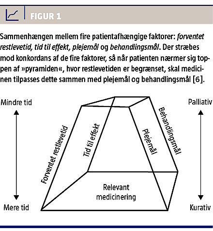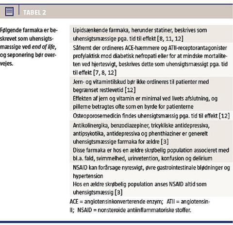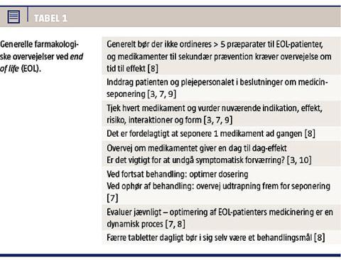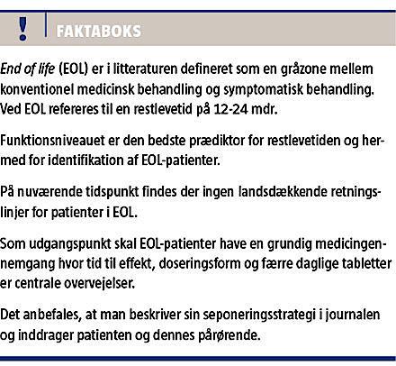 Et specielt område er ældre, der nærmer sig end of life (EOL), hvor man gerne vil reducere medicineringen, både fordi man gerne vil arbejde efter principperne om rational farmakoterapi, fordi den ældre ofte er ked af at skulle have så meget medicin, og fordi Sundhedsstyrelsen har tilrådet reduktion i medicin [4]. Formålet med denne artikel er at gennemgå, hvilke anbefalinger der er vedr. ændring i medicinen, når patienten nærmer sig EOL, og hvorledes man fastlægger, når patienten er ved EOL. Bemærk at EOL ikke er den palliative fase, men den fase hvor den generelle formåen aftager, uden at patienten er døende.