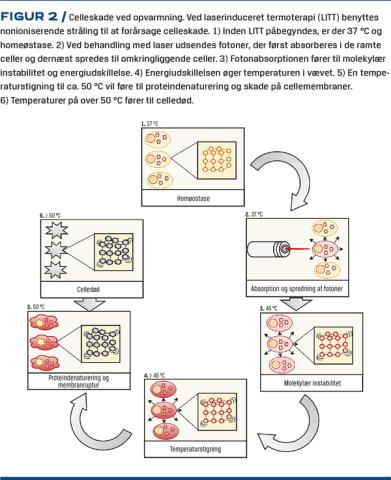 LITT er som kryoablation en minimalt invasiv procedure. Metoden blev første gang brugt til behandling af hjernetumorer i 1966 [9]. Som ved kryoablation udføres proceduren ved indføring af en tynd nål i det væv, der ønskes behandlet. Virkningsmekanismen består i udsendelse af fotoner, der absorberes direkte i vævet og spredes til det omkringliggende væv. Begge dele forårsager varmeudvikling, der leder til proteindenaturering, opløsning af cellemembraner og celledød (Figur 2) [9, 19]. Der sigtes efter at opnå 50 °C i periferien af det behandlede område [20]. Temperaturmonitorering er vigtig, da for hurtig opvarmning skaber dampdannelse og forkulning, hvilket kan føre til stigning i det intrakraniale tryk ved behandling af intrakraniale tumorer [21].