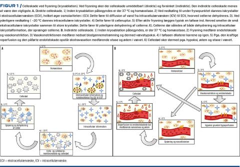 Til placering af kryonålen i det ønskede område og monitorering af iskuglens udbredelse kan man benytte ultralydskanning, CT eller MR-skanning. De to sidstnævnte er egnede til intrakranial brug. Celleskaden ved kryoablation inddeles i direkte og indirekte celleskade (Figur 1). Den direkte celleskade er et resultat af iskrystalformation, først ekstracellulært (0 til –20 °C), hvilket fører til intracellulær dehydrering, og senere intracellulært (< –20 °C). Efter frysningen tør iskuglen enten passivt eller aktivt, inden der igen fryses [14, 15]. Den optimale fryse-tø-fryse-cyklus er ikke entydigt fastlagt, men der er bred enighed om, at cyklussen skal gennemføres mindst to gange [8, 15]. Den vigtigste mekanisme for celleskade ved kryoablation menes at være den indirekte celleskade, der sker som følge af karskader, hvilket resulterer i hypoksi og heraf afledt celledød. Trombose i små kar ses efter 3-4 timer og i større arterier efter et døgn [6].