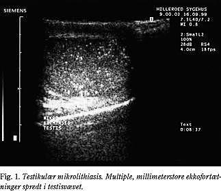 Testikulær mikrolithiasis (TM) betegner mikroforkalkninger i testes. Disse påvises typisk histologisk, men de seneste år er det også blevet muligt at se forkalkningerne med UL-scanning (Fig. 1) grundet på teknologiske forbedringer på dette område. Ved større opgørelser over patienter henvist til UL-scanning af testis har man fundet en forekomst af TM fra 0,5 til 2% (1, 2).