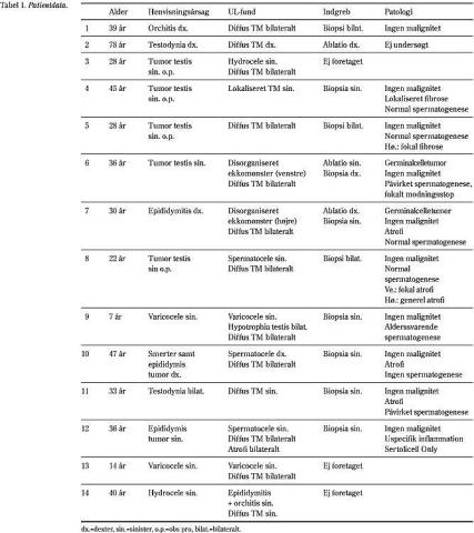 I perioden december 1997 til maj 2000 fik 14 patienter i alderen 7-78 år påvist TM (Tabel 1) ved ultralyd. Alle scanninger blev foretaget af samme radiolog (SGR). Fem var henvist på mistanke om testistumor, tre på grund af testissmerter og seks til udredning for andre tilstande.