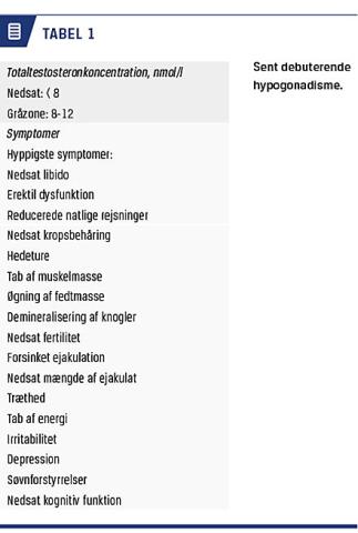 Hypogonadisme er hyppigt forekommende blandt ældre mænd, hvorfor det er en tilstand, som de fleste læger vil møde i deres kliniske hverdag, i såvel primær- som sekundærsektoren. I en stor europæisk opgørelse angives prævalensen til at være 0,1% blandt mænd i fyrrerne stigende til 5,1% blandt mænd i halvfjerdserne [1]. Andre har rapporteret om prævalenser på op mod 25% [2, 3]. Nyere forskning, herunder et randomiseret placebokontrolleret studium med 790 mænd over 66 år, har tydeliggjort gavnlige effekter af testosteronsubstitution (testosterone replacement therapy (TRT)), der blandt andet kan forbedre seksualfunktionen og humøret [4, 5]. Imidlertid er prostatacancer (PCa) den hyppigst forekommende kræftform blandt ældre mænd [6], og siden nobelpristageren Huggins i 1941 præsenterede androgenhypotesen, hvor han beskrev, hvorledes testosteron driver udviklingen af og forværrer PCa, har PCa været en kontraindikation for TRT [7].