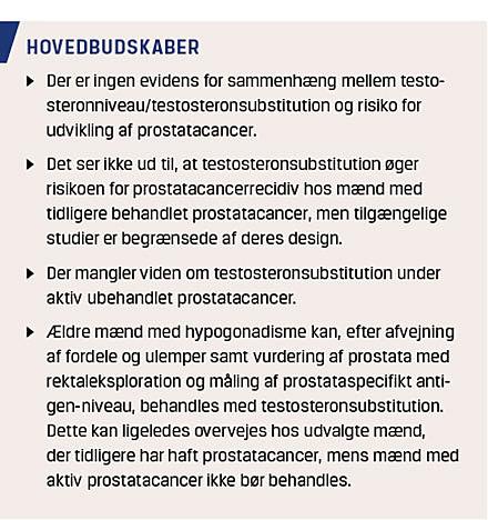 Samlet kan det konkluderes, at der ingen evidens er for en sammenhæng mellem TRT og øget risiko for udvikling af PCa hos mænd, der har hypogonadisme uden PCa. Dette er i sig selv ikke tilstrækkeligt til, at der er tale om et paradigmeskifte, men det må siges, at androgenhypotesen er udfordret. Imidlertid mangler der veldesignede prospektive studier af tilpas størrelse og med lang nok opfølgning, før endelige konklusioner kan drages om TRT hos mænd, der tidligere har fået kurativt intenderet behandling af PCa, og hos mænd med p.t. ubehandlet PCa.