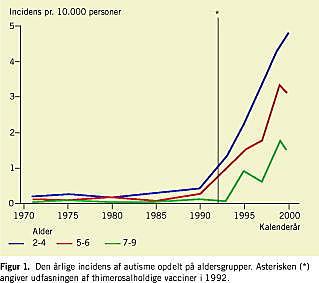 Udfasningen af thimerosalholdige vacciner i Danmark i 1992 blev efterfulgt af en stigning i incidensen af autisme. Disse økologiske data støtter ikke hypotesen om, at thimerosal i vacciner øger risikoen for autisme og underbygger således WHO's nuværende anbefaling på området [15]. Vi kan naturligvis ikke udelukke, at thimerosal i større mængder end de i Danmark anvendte kan medføre autisme og andre gennemgribende udviklingsforstyrrelser.