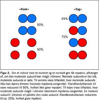 Kloridkonduktansen mangler ikke helt hos patienter med myotoni. Patienter med dominant myotonia congenita har ét sygt og ét normalt gen, hvorfor der skulle være 50% normale subunits. Fordelingen af dimerer skulle da være 25% rask-rask, 50% rask-syg og 25% syg-syg (Figur 2) - og kloridkonduktansen følgelig mindst 25% af det normale. Patienter med recessiv myotonia congenita har to syge gener, hvorfor man kan forestille sig en kloridkonduktans på 0. I praksis er der hos patienter med formodet recessiv myotonia congenita målt kloridkonduktanser på 0-45% [29]. En simpel hypotese er, at en reduktion af kloridkonduktansen til 50% ikke giver myotoni, at en reduktion til 25% altid giver myotoni, og at kloridkonduktanser under 25% medfører de særlige fænotypiske træk, der karakteriserer recessiv myotonia congenita.