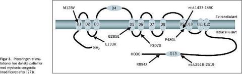 Andre mutationer er forbundet med recessiv arvegang. Muterede subunits kan ikke danne dimerkomplekser (Figur 2). Et eksempel er trunkeringer, hvor et stopcodon introduceres midt inde i genet, hvilket sædvanligvis medfører en ubrugelig subunit og dermed recessiv arvegang. En undtagelse er den hyppigt forekommende mutation R894X (Figur 3 ): Trunkeringen finder her sted så »sent«, at den resulterende subunit stadig kan danne dimerkomplekser. I Danmark er der beskrevet to R894X-familier med dominant og to med recessiv arvegang [27]. I sidstnævnte to familier var raske bærere uden kliniske eller elektromyografiske tegn på myotoni. Det må antages, at andre gener - formentlig tæt koblede til CLCN1 - i betydelig grad kan modificere fænotypen.
