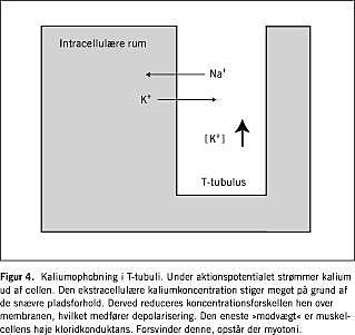 Kloridkonduktansen udgør i hvilende skeletmuskelceller 70-80% af membrankonduktansen [28]. Kloridkonduktansen har i muskelvæv overtaget kaliumkonduktansens sædvanlige rolle: at fastlægge hvilemembranpotentialet. Dette er hensigtsmæssigt, da kaliumgradienten hen over muskelcellemembranen påvirkes kraftigt af kaliumophobning i T-tubuli (Figur 4 ). Under aktionspotentialet akkumuleres kalium uden for cellen, og den ekstracellulære kaliumkoncentration når høje niveauer pga. de snævre forhold i T-tubuli. Uden kloridkonduktansen medfører et enkelt aktionspotentiale en depolarisering på ca. 1 mV, og en serie på 10-20 aktionspotentialer vil depolarisere membranen så meget, at der opstår nye »spontane« aktionspotentialer [18]. Dette er baggrunden for fænomenet myotoni.