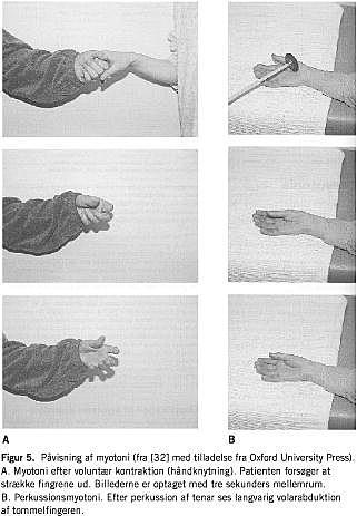 Alle tværstribede muskler kan være involverede, herunder øjen-, ansigts- og tungemuskulatur [31]. Periodisk dysartri og dobbeltsyn er forvirrende symptomer. Myotoni kan påvises som forsinket udretning af fingrene efter håndtryk (Figur 5 A). Direkte irritation af muskler med reflekshammer kan udløse en abnormt langvarig kontraktion (Figur 5B). Ved perkussion af tenar ses volarabduktion af tommelfingeren, ved perkussion af m. ekstensor digitorum communis ses ekstension af fingrene etc. Ved perkussion af store muskler ses evt. kortvarigt en impression på perkussionsstedet [31]. Generelt er muskulaturen veludviklet eller hypertrofisk (Figur 6 ), hvilket formentlig blot er en naturlig følge af den pga. myotonien stærkt øgede muskelaktivitet.