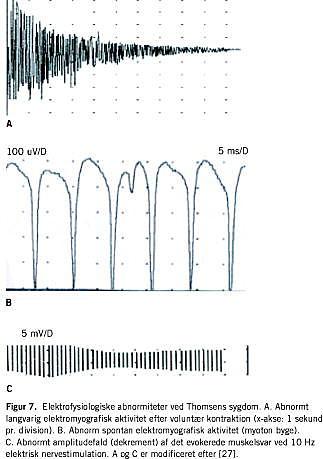 Summary Thomsen's disease (myotonia congenita) Ugeskr Læger 2004;166:3179-3184 Thomsen's disease (myotonia congenita) is a hereditary muscle disease characterized by delayed relaxation of skeletal muscle after voluntary contraction. It was described in 1876 by the Danish physician Julius Thomsen, who himself suffered from the disease. The molecular background of myotonic disorders was discovered a decade ago, but further research is needed to fully explain the pathophysiology of myotonia and the marked phenotypic diversity characterizing myotonic disorders. This review provides an updated description of the disease with particular reference to ongoing research regarding the Danish population of patients with Thomsen's disease.