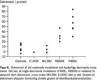 Resultaterne af rutinemæssige nerveledningsundersøgelser er normale hos patienter med Thomsens sygdom, men ved repetitiv stimulation (10 Hz) ses hos nogle patienter et abnormt fald (dekrement) i muskelsvarets amplitude [34, 35]. Fænomenet afspejler inaktivering af muskelfibre pga. depolarisering og er mest udtalt hos patienter med recessiv myotonia congenita. Ved dominant myotonia congenita afhænger dekrementets størrelse af mutationstypen: Mutationen P480L, som findes hos medlemmer af dr. Thomsens familie, er relateret til udtalt dekrement (Figur 7C), mens andre dominante mutationer er relateret til et mindre eller insignifikant dekrement (Figur 8 ). Det er kendt, at P480L-mutationen giver en usædvanligt stor reduktion af kloridkonduktansen [36]. Da recessiv myotonia congenita er forbundet med endnu lavere kloridkonduktans, er det logisk at antage, at dekrementets størrelse direkte afspejler kloridkonduktansen. Det rummer interessante perspektiver, at en noninvasiv test, som kan udføres på få minutter, kan give kvantitativ information om ionkanalers funktion.