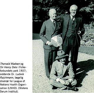 Madsen var fra 1921 præsident for Folkeforbundets Health Committe. Han fik dannet Commission on biological Standardisation med ham selv som formand og Sir Henry Dale, leder af det britiske National Institute of Medical Research som næstformand (Figur 1 ). SSI kom til at stå for standardisering af serologiske produkter mens det britiske institut tog sig af øvrige produkter (hormoner mv.). Madsen var fascineret af epidemiologi og havde held til at overbevise Rockefeller Foundation om Danmarks unikke muligheder for at være et »epidemiologisk feltlaboratorium« [2]. Det medførte penge til bygninger og en tuberkuloseepidemiologiundersøgelse, som reducerede skepsis om BCG-vaccination hos fagfolk og befolkningen [2].