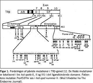 De fleste mutationer af TRβ 1 er lokaliseret omkring tre hot-spots i ligandbindingsdomænet (Figur 1 ) og påvirker herved receptorens evne til hormonbinding. Dette giver anledning til syndromet THR [1]. Der kendes foreløbig over 90 punktmutationer i en af TRβ -genets alleler, samt enkelte andre mutationsformer. Hovedparten af punktmutationerne er nukleotidsubstitutioner, der medfører udskiftning af en enkelt aminosyre i receptorens ligandbindende domæne [5, 6].