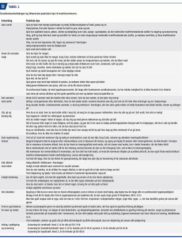 Et stigende antal danske patienter, som diagnosticeres med kræft, overlever sygdommen. En af årsagerne til den øgede overlevelse skal findes i stadig mere individualiserede behandlinger, herunder kombinationen af forskellige behandlingsmodaliteter. Behandlingen er dog ikke uden omkostninger for den enkelte. Er man diagnosticeret med kræft som voksen, har man dobbelt så høj risiko som baggrundsbefolkningen for senere i livet at udvikle en ny kræftsygdom [1]. Tal fra USA dokumenterer, at sekundær malignitet udgør 18% af alle nye kræfttilfælde og overstiger antallet af førstegangstilfælde af brystkræft, lungekræft og prostatakræft [1]. Det anslås, at 35% af den øgede risiko for ny primær cancer blandt kræftoverlevere kan forklares med henvisning alene til alkohol og rygning [1]. Hertil kommer en væsentlig forøget risiko for udvikling af kardiovaskulær sygdom, diabetes og osteoporose blandt kræftoverlevere [1, 2]; foruden betydelig prævalens af senfølger, herunder træthed og smerter, som i sig selv kompromitterer den enkeltes sundhed og livskvalitet. Depression forekommer hos 20% inden for de første fem år efter behandlingen og har sandsynligvis indflydelse på overlevelse [3, 4]. Samtidig er den sociale ulighed i overlevelse efter kræft markant og optræder inden for alle kræftsygdomme, uafhængigt af om sociale forhold spiller en rolle for forekomsten eller ej [5]. På den baggrund er der igennem de seneste ti år opstået en stigende anerkendelse af vigtigheden af forebyggende og sundhedsfremmende indsatser. Formålet med denne artikel er at sammenfatte det videnskabelige grundlag for sundhedsanbefalinger til kræftoverlevere og dermed understøtte fokus på patient-