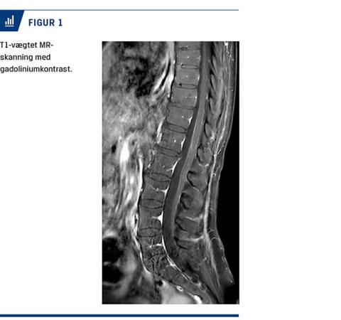 Ved en objektiv undersøgelse fandt man nedsat kraft i alle fire ekstremiteter, men mest udtalt i benene og særligt over hoften uden supranukleær fordeling. Der blev fundet ataksi trunkalt og i ekstremiteterne. Senereflekser var fraværende, og plantarresponset var normalt. Sensibiliteten var bevaret, men med allodyni distalt i underekstremiteterne. Kranienerverne var upåvirkede. Undersøgelse af cerebrospinalvæsken (CSV) viste mononukleær pleocytose på 90 × 106/l kerneholdige celler (referenceværdi: < 5 × 106/l) med 91% mononukleære leukocytter, moderat forhøjet proteinniveau på 3,23 g/l (referenceværdi: 0,15-0,50 g/l) og glukoseniveau på 3 mmol/l (referenceværdi: 2,2-3,9 mmol/l). Gentaget efter to og tre uger var der nærnormalisering af celletællingen og let forhøjet proteinniveau. Gentagne undersøgelser for herpes simplex-virus-1 og -2, varicella-zoster-virus, hiv, syfilis, hepatitis E og borrelia var negative. En polymerasekædereaktion (PCR) for TBE i CSV var negativ. Initiale serologiske undersøgelser for TBE-antistoffer i oktober var positive for immunglobulin (Ig)M, men ikke for IgG. Da undersøgelserne blev gentaget efter fire uger, var patienten positiv for IgM og IgG. En MR-skanning med kontrast af columna viste leptomeningeal kontrastopladning ved conus medullaris og filum terminale (Figur 1). En nerveledningsundersøgelse (NLU) viste svært nedsatte motoriske amplituder, moderat nedsatte sensoriske amplituder og nedsatte nerveledningshastigheder i alle fire ekstremiteter uden affektion af nn. suralis.