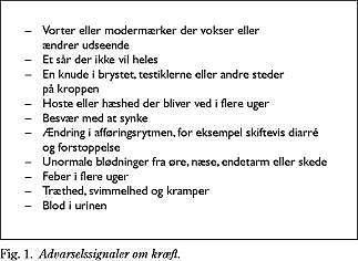 Tidlig diagnose indebærer, at sygdommen er mindre omfattende, og at behandlingsmulighederne er flere, og mere effektive og skånsomme, således at sygdom og behandling medfører lavest mulig morbiditet og mortalitet. Sloganet »Kræft som opdages i tide kan helbredes« fra Kræftens Bekæmpelse var oversættelsen af disse kendsgerninger til et løfterigt og letfatteligt budskab til befolkningen. »Advarselssignaler om kræft« blev den operationelle beskrivelse af nyttige observationer og handlemuligheder, som først og fremmest består i at henvende sig til læge med henblik på diagnosticering af en mulig kræftsygdom ved oplevelse af de anførte symptomer. Kræftens Bekæmpelse angiver i sine seneste publikationer ti advarselssignaler og inkluderer så brede symptomer som træthed, svimmelhed og feber i flere uger (Kræftens Bekæmpelse: www.cancer.dk) (Fig. 1 ). Der er publiceret sporadiske vurderinger af befolkningens opmærksomhed på og handlinger i forhold til advarselssignalerne. Den generelle konklusion er, at der reageres vidt forskelligt på de forskellige advarselssignaler. Eksempelvis er patienters opdagelse af en knude i brystet og synligt blod i ekspektorat og urin de advarselssignaler, som bringer de fleste patienter hurtigt til læge, men 20-30% af patienterne anlægger observationstid eller vil ikke opsøge læge for ændring i afføringsvaner og blod i afføringen eller hoste og hæshed (4). Nørrelund et al har i en flerfaset undersøgelse vedrørende blødning fra endetarmen fundet, at knap 12% af 40-årige inden for de foregående seks måneder angav at have haft blødning fra endetarmen. 22,5% af disse oplyste at have kontaktet deres APL i den anledning, men den heraf beregnede konsultationsrate for symptomet blødning fra endetarmen forekom usandsynlig (5, 6). I en supplerende undersøgelse (7) fandt man, at 40% af befolkningen ikke inspi- cerede kumme eller toiletpapir, og at færre end en af tre personer søgte læge for blødning fra endetarmen. Nørrelund et al fandt i en interviewundersøgelse af 684 personer (8), at sammenhængen mellem blødning fra endetarmen og kræftsygdom blev omtalt af ca. halvdelen af deltagerne, og at 15% af mændene og 23% af kvinderne mente, at kræft var den hyppigste årsag. Knap 30% af deltagerne havde observeret blødning fra tarmen på et tidspunkt, og to tredjedele angav at have opsøgt APL i den anledning. Der var ikke forskel på den oplyste konsultationshyppighed blandt dem, der nævnte, og dem der ikke nævnte kræft som mulig årsag. Der blev fundet et lignende mønster for andre advarselssignaler såsom uforklarligt vægttab, blodigt opspyt og en knude i brystet.