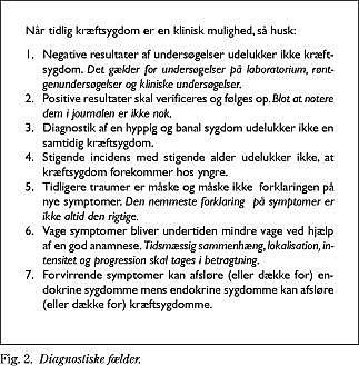 Det er tilbagevendende i litteraturen og den kliniske virksomhed, at muligheden for tidlig diagnose af en kræftsygdom afhænger af en årvågenhed i en udførlig anamneseoptagelse og en grundig almen klinisk undersøgelse suppleret med målrettede paraklinisk undersøgelser, der er relateret til de oplyste symptomer. Opmærksomheden støttes af APL's erkendelse af og bevidsthed om, at kræftsygdomme forekommer hos 7-8 patienter hvert år. Aktiv og ihærdig diagnostik er vejen frem, når der er opstået en mistanke om en kræftsygdom. Ved upræcise symptomer og usikre kliniske fund, skal der aftales en opfølgning enten i egen praksis eller gennem henvisning. Konstatering af anæmi eller forhøjet sænkningsreaktion, eventuelt som »tilfældigt fund«, skal følges op, indtil årsagen er fastlagt. I forhold til ældre patienter og rygere skal overvejelsen om, hvorvidt symptomerne kunne tyde på en kræftsygdom, tidligt være formuleret og evalueret. Der er publiceret en manual (27) for APL som en støtte for lægen i den komplekse diagnostiske proces, som tager udgang i patientens alder, symptomer, tidligere sygdomme og livsførelse og inddrager organrelaterede symptomer samt praksisrelevante epidemiologiske data. Fig. 2 fra manualen indeholder typiske »fælder« for lægen undervejs i de diagnostiske overvejelser.