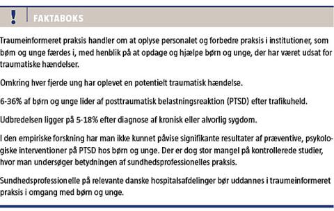 Artiklens formål nås ad tre skridt. Først redegøres der for udbredelsen af akut og posttraumatisk stress blandt børn og unge. Derefter undersøges den nuværende empiriske viden om tidlige indsatser til forebyggelse af PTSD hos børn og unge. Til slut præsenteres begrebet traumeinformeret praksis på baggrund af amerikansk erfaring. Med afsæt i den præsenterede viden konkluderes der en række best practice-principper for traumeinformeret praksis til brug på danske hospitalsafdelinger og anbefalinger til fremtidige tiltag på området.