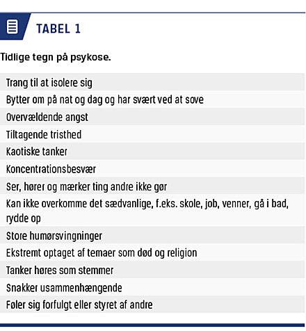Tabel 1 viser en række tidlige tegn på psykose, denne information indgår i informationskampagnen. Figur 1 er ligeledes fra informationskampagnen.
