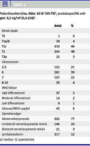 Resultater: Medianalderen ved operation var 63 år med en stigende tendens. Klinisk T-kategori forblev uændret i perioden, mens der var et signifikant fald i præoperativt prostataspecifikt antigen-niveau. Som refleksion af kirurgisk rutinering og optimering af patientforløbene blev der fundet et signifikant fald i operationstid, transfusionsbehov og indlæggelsestid. Samlet blev der registreret en eller flere komplikationer hos 164 patienter (22,8%), blandt disse var otte (1,1%) alvorlige komplikationer. Der blev registreret et postoperativt dødsfald.