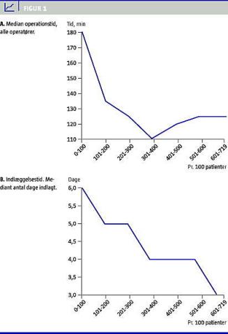 Operationstid - tid fra hudincision til lukning - er opgjort fra anæstesiskema i femminuttersintervaller. Transfusionsbehovet er opgjort som antal erytrocytsuspensioner givet under indlæggelse. Antal dage med dræn blev beregnet fra operationsdato til fjernelse. Kriteriet for drænfjernelse var hele perioden < 30 ml/24 timer. Indlæggelsestid er opgjort fra operationsdato til udskrivelsesdato. Ændringer over tid er opgjort pr. 100 patienter.