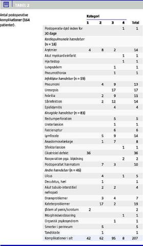 Komplikationer inden for 30 dage postoperativt er opgjort enkeltvis og kategoriseret efter sværhedsgrad [3]. Kategori 1 omfatter de ikkebehandlingskrævende situationer. Kategori 2 omfatter behandlingskrævende komplikationer, der ikke medførte forlænget indlæggelse. Kategori 3 omfatter behandlingskrævende komplikationer, der medførte reoperation og/eller forlænget indlæggelse. Kategori 4 omfatter komplikationer, der medførte intensiv behandling, akut reoperation af potentiel livstruende tilstand, blivende sequelae og/eller død.