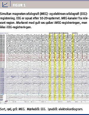 Med MEG kan man registrere det magnetiske felt, som genereres af hjernens elektriske aktivitet. Ved konventionel elektroencefalografi (EEG) hæmmes de elektriske signaler fra hjernen af kraniet, huden m.m., og bl.a. derfor viser EEG til tider normale forhold, på trods af at patienten har symptomer, der er forenelige med epilepsi [2]. Disse fejlkilder kan teoretisk fjernes, når man benytter MEG til at lokalisere det epileptiske fokus [3, 4]. Der foreligger endnu ikke tilstrækkelig litteratur om den kliniske anvendelighed af MEG.