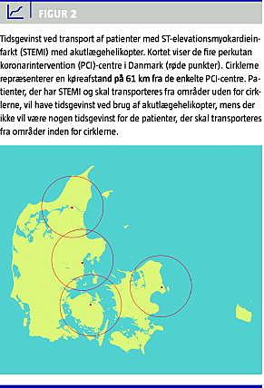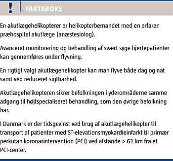 For patienter med ST-elevationsmyokardiein-farkt (STEMI) er det veldokumenteret, at der er gevinst ved at blive transporteret direkte til et hjerte-center med henblik på primær perkutan koronarinter-vention (PPCI), frem for at få trombolysebehandling lokalt [2, 3]. I Danmark er PPCI indført som en national behandlingsstrategi for patienter med STEMI [4]. PPCI nødvendiggør, at patienterne bliver transporteret direkte til de regionale perkutan koronarintervention (PCI)-centre, hvilket medfører en længere transportafstand og dermed en forlængelse af system-delay (tiden fra 1-1-2-opkald til PPCI). I de europæiske kliniske retningslinjer anbefaler man, at PPCI udføres inden for 120 minutter fra første kontakt til sundhedsvæsenet [5]. Dette behandlingsmål kan være en udfordring vedrørende patienter, der bor i yderom-råderne langt fra PCI-centrene. Præhospital teleme-dicinsk elektrokardiografidiagnostik og direkte visi-tation til PPCI ifølge med kvalificeret præhospitalt personale medfører signifikant reduktion af system-delay og dermed mortalitet og morbiditet [6-9], men det er ikke tilstrækkeligt til, at alle patienter i Danmark kan få PPCI inden for den anbefalede tidsramme. Hurtigere transport med helikopter er foreslået til de STEMI-patienter, der bor > 100 km fra et PCI-center [10].