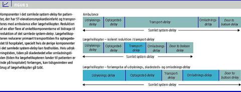 Samlet system- delay for patienter med STEMI er i Danmark den tid, der går fra patienten ringer 1-1-2 til PPCI. System- delay består af flere komponenter, som er illustreret i Figur 1 . Maksimal tidsgevinst og mindst mulig system- delay ved brug af lægehelikopter til transport af patienter med STEMI er afhængig af, at helikopteren sendes hurtigt af sted efter 1-1-2-opkaldet, når hurtigt frem, kan lande tæt ved patienten både dag og nat, har kort nedsluknings- og opstartstid og kan lande tæt ved hospitalet, således at forsinkelse i forbindelse med omladning til ambulance undgås. Manglende optimering af disse forhold kan medføre, at den potentielle tidsgevinst ved brug af lægehelikopter reduceres eller forsvinder.