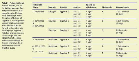 Dette tidsstudium udgør en kvantitativ del af et større anlagt kvalitativt feltstudie, der blev gennemført ved Aarhus Universitet i perioden 2000-2004 [7]. Feltstudiet er baseret på observation af seks ottendesemesterstuderende i løbet af deres medicinske og kirurgiske klinikophold på to forskellige universitetssygehuse i Århus Amt