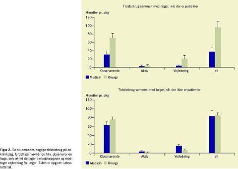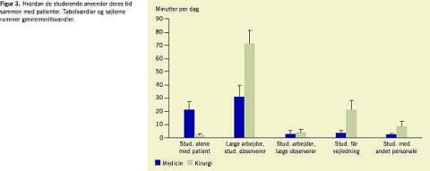 De observerede lægestuderende tilbragte ca. en tredjedel af den samlede tid på klinikstedet sammen med patienter (25% af tiden på medicinske afdelinger, 43% af tiden på kirurgiske afdelinger). Af Figur 3 fremgår det af den midterste søjle, at de studerende - mindre end fem minutter daglig - deltog aktivt i arbejdet med patienter, mens en læge iagttog, hvad de gjorde. Dette forhold gjorde sig gældende på både medicinske og kirurgiske afdelinger.