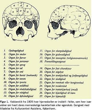 Carl Otto (1795-1879) fik efter nøje undersøgelser af sit eget kranium bekræftet, at han var et »Gemyts- og ikke et Forstandsmenneske « [1]. Dette udsagn bygger på en lære om hjernen, som først blev udviklet af den i citatet nævnte J.F. Gall (1758-1828) og senere i hans samarbejde med J.C. Spurzheim (1776-1832) fik betegnelsen frenologi. Den frenologiske lære antog, at hjernen er sæde for de psykiske eller sjælelige egenskaber (Figur 1 ). Jo mere udpræget en egenskab er, desto mere udviklet er det modsvarende område i hjernen. De udviklede områder former kraniet med forhøjninger og furer. Ved grundige empiriske studier af kraniets ydre form kan lægen således få indblik i personernes sjælelige egenskaber [2].