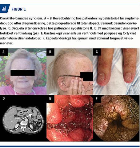 Cronkhite-Canadas syndrom (CCS) er en idiopatisk nonhereditær sygdom, der er karakteriseret ved gastroinstestinal polypose, dysgeusi, malnutrition/-absorption, total alopeci og onykolyse [1-4]. Sygdommen rammer hyppigere mænd end kvinder (M:K-ratio 1,85:1) med symptomdebut i 65-årsalderen [2]. Der er kun rapporteret om 500-600 tilfælde af CCS, siden det først blev beskrevet i 1955 [1, 2, 4], heraf hovedparten i Japan [3]. Det var således usædvanligt, da det første tilfælde blev diagnosticeret på Fyn i 2008, og endnu mere da vi diagnosticerede det andet tilfælde i 2016.