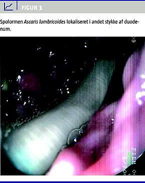 Ved gastroskopien fandt man svarende til andet stykke af duodenum en ca. fem centimeter lang askeride, der var svagt grønfarvet af galde efter forsøg på migration op i ductus choledochus (Figur 1 ). Para-sitten blev forsøgt fjernet endoskopisk, men forsvandt ned i jejunum. Patienten blev sat i behandling med tabletformig Vermox 500 mg som engangsdosis. Patienten udeblev fra opfølgende kontrol.