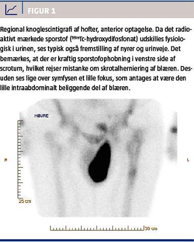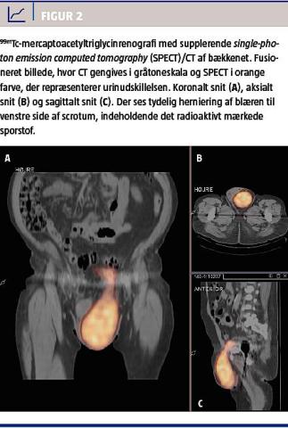 Han fik efterfølgende foretaget knoglescintigrafi pga. mistanke om løshed af en hofteprotese. Herved blev der påvist ophobning af det radioaktive sporstof i venstre del af scrotum og gav således mistanke om urinindhold i scrotum (Figur 1). Patienten blev indkaldt til renografi og single-photon emission computed tomography (SPECT)/CT (Figur 2). Renografien viste normal udskillelse i nyrerne uden tegn til afløbshindring. En dynamisk optagelse under miktion viste, at miktion kun var mulig ved kompression af venstre skrotalhalvdel. Ved kompression sås retrograd tømning af skrotalindhold til den suprapubisk beliggende blære og derefter til urethra. Yderligere viste CT med kontrast, at kun en lille del af blæren var beliggende i det lille bækken, mens størstedelen var beliggende i scrotum. Ved nærmere vandladningsanamnese fremgik det, at initiering af miktion altid skete ved tryk på scrotum, og at tømning skete ved at trykke scrotum tom. Ved flekscystoskopi sås en lille sammenfalden blære og en divertikelåbning med lumen på 2-3 cm, der førte ind i en stor skrotal divertikel.