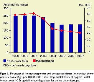 Hormonpræparater til behandling af klimakterielle gener har altid haft generelt tilskud, undtagen lægemidler som indeholder tibolon og drospirenon + østrogen. Figur 2 viser forbrugsudviklingen for hormonpræparater for kvinder over 40 år. Der ses et faldende forbrug fra 2002 til 2004, hvorefter forbruget opgjort i antal kvinder er stagneret, mens mængdeforbruget fortsat er faldet, hvilket betyder, at der anvendes lavere doser eller kortere behandlingsvarighed. Da der ikke har vær et ændringer i tilskudsstatus for hormonpræparaterne, er forbrugsudviklingen udelukkende forårsaget af andre faktorer. I 2002 og 2003 blev der publiceret data, der viste en øget risiko for bl.a. hjertekarsygdom og brystkræft ved hormonbehandling [3-5], hvilket falder tidsmæssigt sammen med det største fald i forbruget, så det har formodentlig været en væsentlig medvirkende faktor.