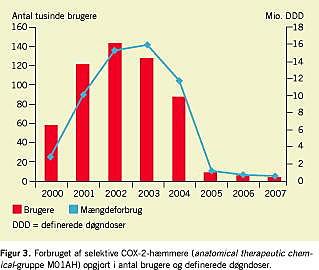 Den første selektive COX-2-hæmmer, rofecoxib, blev markedsført i slutningen af 1999. Celecoxib blev markedsført i 2000 og etoricoxib i 2003. Figur 3 viser udviklingen i forbruget af selektive COX-2-hæmmere fra 2000 til 2007. Forbruget steg kraftigt frem til 2002, hvorefter det begyndte at falde med et fald på ca. 90% (90,4% i mængdeforbruget og 88,3% i antal brugere) fra 2004 til 2005. Siden har forbruget stabiliseret sig på dette niveau.