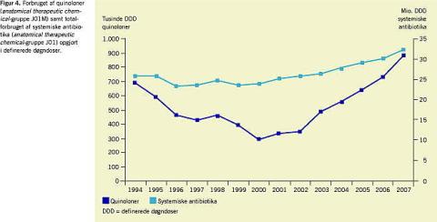 Gruppen af quinoloner havde generelt tilskud indtil maj 1999. På baggrund af quinolonernes resistensudviklende potentiale blev det generelle tilskud fjernet for at forebygge et uhensigtsmæssigt forbrug. I Figur 4 ses mængdeforbruget af henholdsvis quinoloner og alle systemiske antibiotika fra 1994 til 2007. Forbruget af quinoloner var faldende frem mod fjernelsen af det generelle tilskud i 1999. Derefter faldt forbruget yderligere i 2000. Siden har forbruget været stigende fra 2002 og frem til 2007. Det samlede forbrug af systemiske antibiotika har ligeledes været stigende, men ikke i samme grad som for quinolonerne. Over en længere periode er forbruget af quinoloner dermed steget trods tilskudsændringen. I midten af 2002 blev de første generika med indhold af ciprofloxacin markedsført, hvilket bevirkede et fald i behandlingsprisen. Dette kan have haft indflydelse på forbruget af quinoloner og være en del af forklaringen på det stigende forbrug.