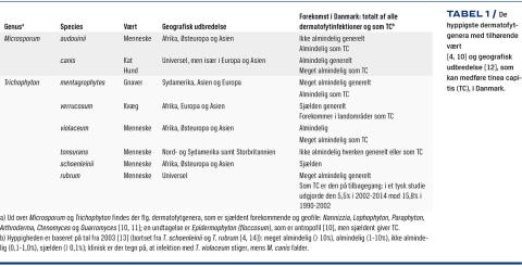 TC skyldes infektion med dermatofytter, som er skimmelsvampe med præference for keratiniseret væv [2]. Der findes ni dermatofytgenera [10, 11] (Tabel 1), men vigtigst for infektion i hårbunden er Microsporum og Trichophyton. Tidligere var det primært de zoofile f.eks. M. canis (hund og kat) og T. mentagrophytes (gnavere), som var årsag til sygdommen, mens den nu i højere grad skyldes infektion med antropofile dermatofytter som f.eks. T. violaceum, T. tonsurans og M. audouinii [1, 13, 14] (Tabel 1). Den øgede forekomst af T. violaceum kobles til migrationen fra Afrika og Mellemøsten, hvor denne antropofile dermatofyt forekommer endemisk [1, 12].
