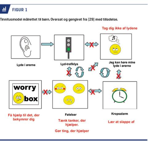 Da der ikke er udviklet nogen standardiserede tinnitusspørgeskemaer, der kan bruges hos børn, er indsamling af information stærkt afhængig af det kliniske interview. The Child Friendly Tinnitus Model [29] er en modificeret billedversion af den »psykologiske model af tinnitus« fra McKenna et al [30]. Modellen bruges som en ramme for både informationsindsamling og rådgivning af børn og forældre om tinnitus [12]. Figur 1 viser modellen i brug som forklaringsmodel og er en pædagogisk fremstilling af samspil mellem det auditive cortex, thalamus, amygdala i det limbiske system og det autonome nervesystem. Et trafiklys repræsenterer det centrale lydsystem i hjernen, der bestemmer, om lyde får bevidst opmærksomhed eller ej. Når lydene får en bevidst opmærksomhed, kan de blive forbundet med tanker og en følelse af fare. Derved kan amygdala stimulere det autonome nervesystem, i denne model symboliseret ved et vækkeur. I den børnevenlige version er der tilføjet en »bekymringsboks«, som repræsenterer eksterne belastninger, såsom eksamener, mobning eller andre vanskeligheder, som barnet kan møde. Disse eksterne belastninger har også indflydelse på systemet [12, 29]. Man har endnu ikke i nogen studier undersøgt behandlingsresultaterne for børn med tinnitus ved brug af Practice Guidance og Child Friendly Tinnitus Model.