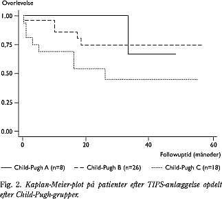 Patienterne i Child-Pugh-gruppe C havde som forventet specielt på længere sigt en ringere overlevelse end patienterne i de andre grupper. Etårsoverlevelsen var henholdsvis 85% og 70% for gruppe B og C, mens treårsoverlevelsen var henholdsvis 75% og 45% (Fig. 2 ).