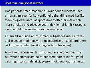 Hos patienter med moderat til svær UC, der er refraktær over for konventionel behandling med kortikosteroider og/eller immunsuppressive stoffer, vil infliximab kunne inducere et klinisk respons, klinisk og endoskopisk remission defineret ved Mayo-score og reducere kolektomiraten på kort sigt. Dosis af infliximab til UC bør holdes på 5 mg/kg, eftersom der ikke kan påvises gunstigere effekt af større doser, og incidensen af alvorlige komplikationer korrelerer med dosis. Det skal kraftigt understreges, at Cochrane-review' ets effektmål var induktion og ikke vedligeholdelse af remission, ligesom Cochrane-review' et er totalt domineret af ACT-studierne. Anbefalinger vedrørende hvornår, hvor længe og med hvilke intervaller infliximab bør administreres til UC-patienter kan på nuværende tidspunkt ikke angives, eftersom behandlingsregimenerne i studierne var inkonsistente. Det er også uvist, hvilken remissionsbevarende behandling patienterne skal tilbydes, hvis de opnår remission efter infliximabbehandling.