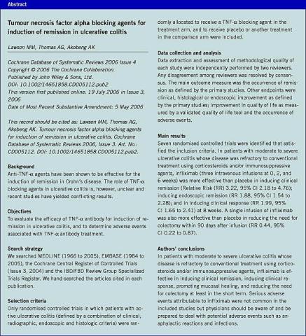 - Lawson MM, Thomas AG, Akobeng AK. Tumour necrosis factor alpha blocking agents for induction o f remission in ulcerative colitis. Cochrane Database of Systemic Reviews 2006, Issue 3: Art No CD005112. DOI: 10.1002/ 14651858.CD005112.pub2.