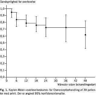 Opgørelsen viser, at TNF-α-hæmmende behandling med Etanercept 25 mg × 2 subkutant ugentlig tåles godt af et flertal af patienter, men seponeres hos ca. en tredjedel af patienterne på grund af f.eks. manglende effekt eller infektion. Om Etanercept skal seponeres eller pauseres som følge af infektion, må vurderes på baggrund af såvel effekten, patientens komplians og infektionens sværhedsgrad. Dette synes normalt at kunne afgøres inden for tre måneder.