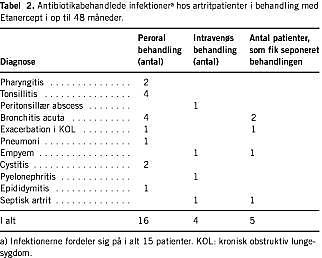 I alt fik 15 patienter 20 antibiotikakrævende infektioner fordelt over hele behandlingsforløbet. De fleste var ukomplicerede luftvejsinfektioner, som blev peroralt behandlet. Fire patienter fik svære infektioner, som kun medførte seponering af Etanercept i et tilfælde (Tabel 2 ). Den ene patient fik em-pyem, men på grund af god effekt af Etanercept, fortsatte patienten hermed trods påbegyndt peroral behandling med antibiotika. Etanerceptbehandlingen blev først seponeret to uger senere ved planlagt kontrol. En anden patient fik peritonsillær absces, men kunne efter en pause genoptage Etanerceptbehandlingen med samme effekt som tidligere. Der fandtes ikke sammenhæng mellem udvikling af svær infektion og supplerende steroidbehandling. Hos seks patienter sås der i begyndelsen af behandlingen forbigående rødme ved indstiksstederne.