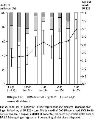 50% af patienterne havde en god forbedring (> 1,2), og 32 % havde moderat forbedring (> 0,6 til ≤1,2) af DAS28 efter en uge. Denne forbedring holdt sig perioden igennem (Fig. 2 ).