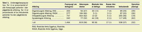 Fordi bortfaldet i undersøgelsen var relativt stort, har vi foretaget en bortfaldsanalyse til sammenligning af inkluderede og ikkerespondenter. Via »Det grønne system« var det muligt at sammenligne de to grupper mht. køn, og hvorvidt der var stillet en operationsindikation. Analysen blev baseret på en stikprøve på 20% (163 patienter) af ikkerespondenterne. Der fandtes en lille og ikkesignifikant kønsforskel mellem de inkluderede og ikkerespondenterne (59% kvinder vs. 57% kvinder). Herudover fandtes der næsten identiske andele af patienter, som havde fået stillet en operationsindikation (31% af ikkerespondenterne mod 32% af de inkluderede (ikkesignifikant)).